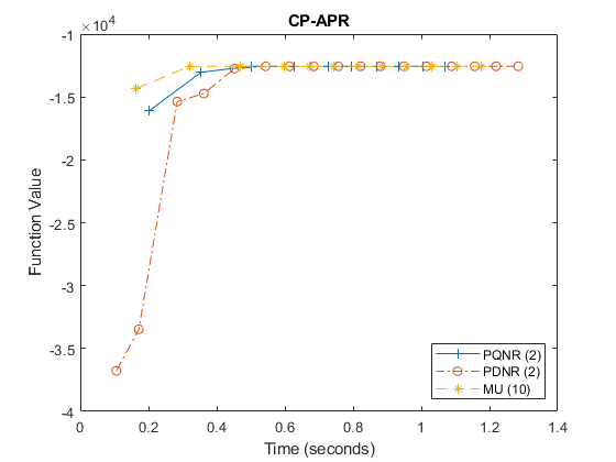 figure(1); clf; tf = ~isnan(output_pqnr.fnVals); plot(output_pqnr.times(tf), 1-output_pqnr.fnVals(tf),'-+','DisplayName','PQNR (2)'); hold on; tf = ~isnan(output_pdnr.fnVals); plot(output_pdnr.times(tf), 1-output_pdnr.fnVals(tf),'-.o', 'DisplayName','PDNR (2)'); tf = ~isnan(output_mu.fnVals); plot(output_mu.times(tf), 1-output_mu.fnVals(tf),'--*', 'DisplayName','MU (10)'); hold off; title('CP-APR'); xlabel('Time (seconds)'); ylabel('Function Value'); legend('Location','SouthEast')